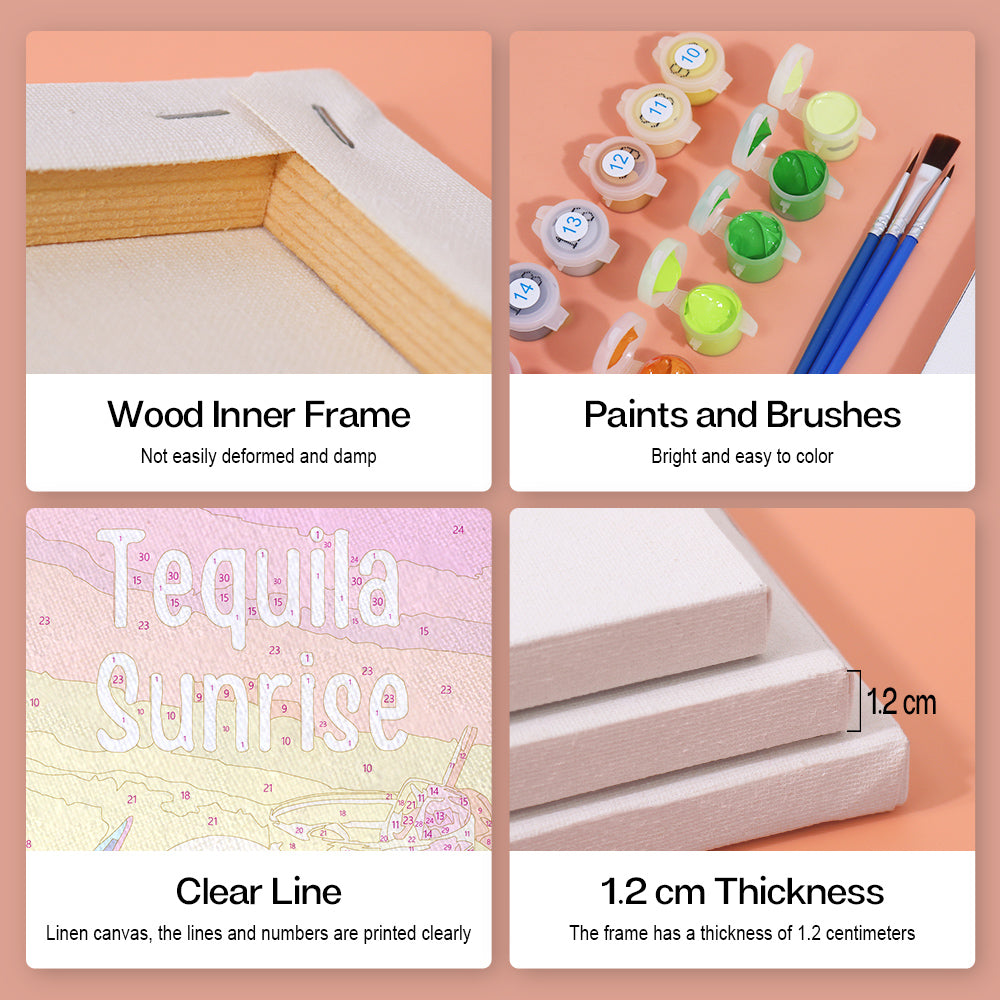 Descubre todo lo esencial perfectamente empaquetado en nuestro kit de Pintura por Números. Con cada componente etiquetado y listo para usar, podrás centrarte únicamente en tu viaje artístico. Desde las pinturas vibrantes hasta los pinceles de precisión, nos hemos asegurado de que nada se interponga entre tú y tu lienzo. Adecuado tanto para principiantes como para artistas experimentados, este kit ofrece una experiencia de pintura pura y sin interrupciones.