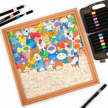 Monta el puzzle y usa los rotuladores incluidos para colorear cada detalle, desde animales adorables hasta formas llenas de fantasía.