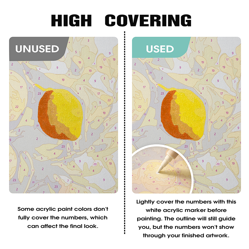 Perfecciona tu obra de arte de pintar por números con este esencial set de marcadores de pintura acrílica blanca. Diseñado para cubrir los números impresos, los contornos y pequeñas imperfecciones, ayuda a crear un acabado limpio y pulido en tu lienzo.